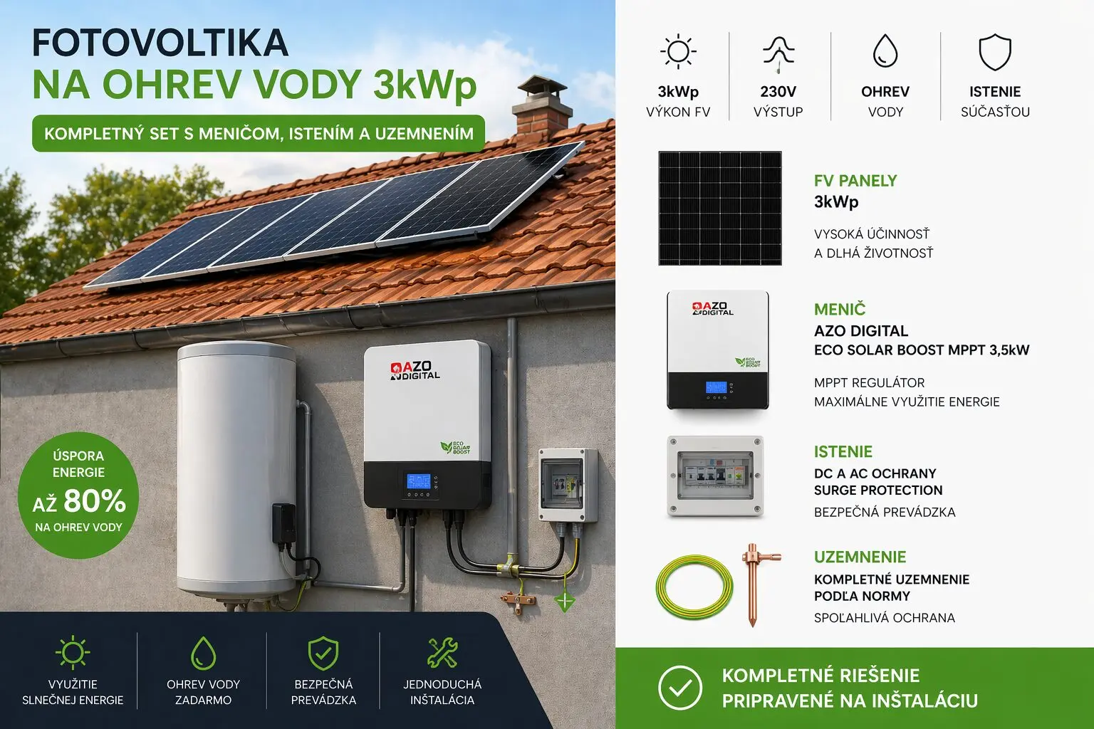 Fotovoltický set pre ohrev vody využíva energiu zo slnka na napájanie elektrického bojlera cez MPPT regulátor. Vyrobená energia sa okamžite premieňa na teplo bez strát do distribučnej siete.